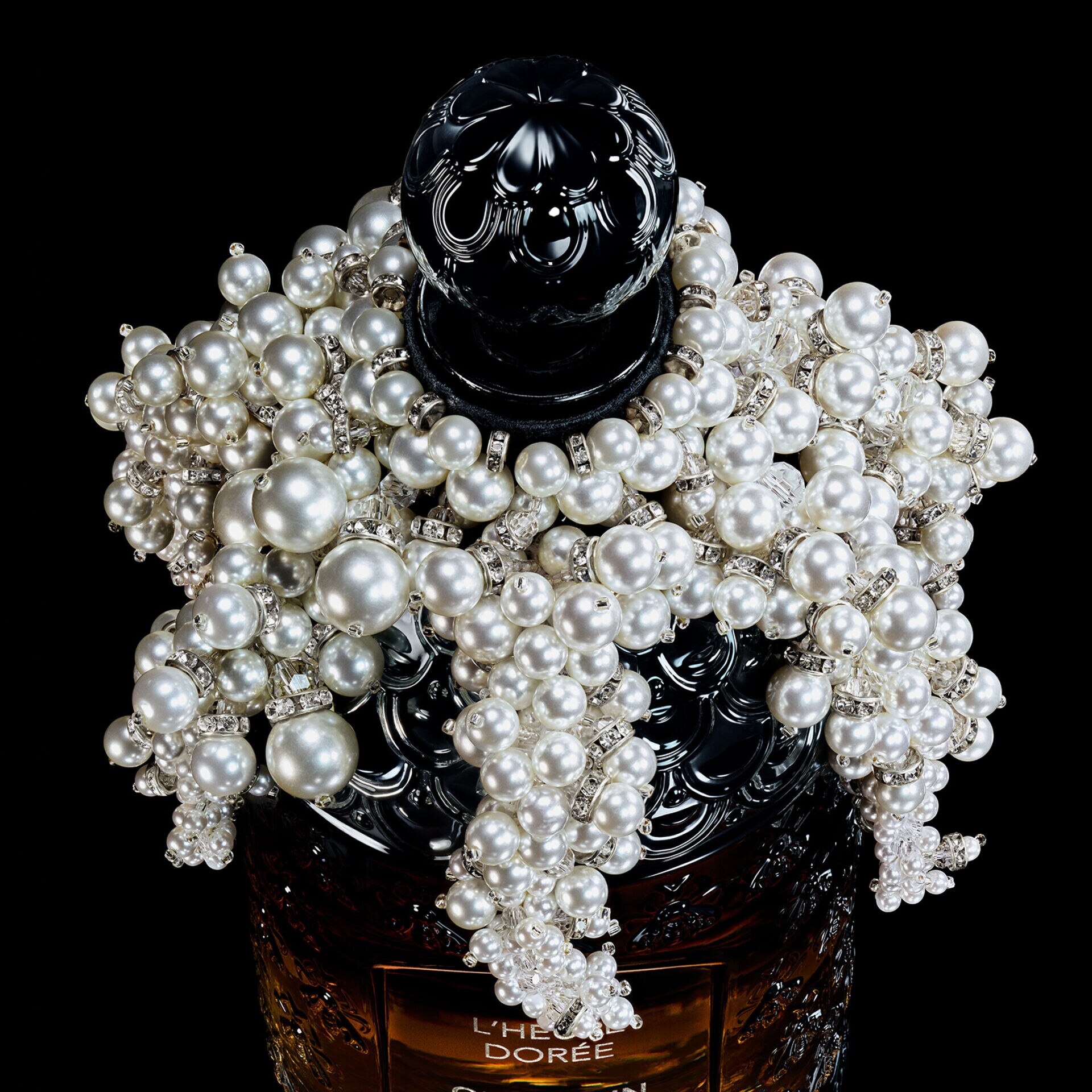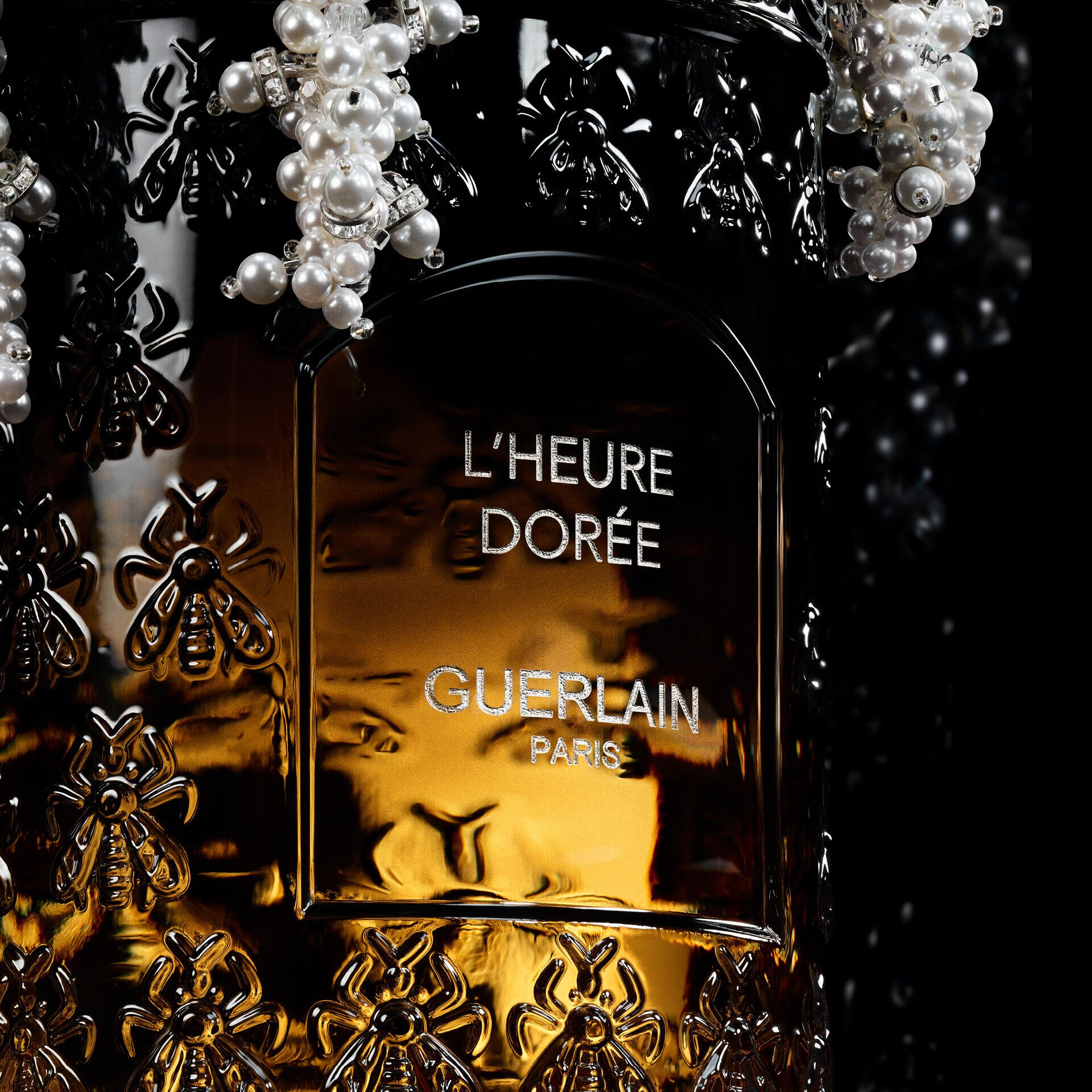 鎏光與珠光交織,譜寫唯美交響曲,近170年來備受珍視的經典蜂印瓶披上一層細緻刺繡,珍珠如輕紗的流瀑傾瀉而下,在朦朧間層層綻放。瓶身以極致精湛的刺繡工藝為設計靈感,漸層漆藝喚起對神秘夜晚的遐想,閃動著稍縱即逝的流光,再點綴璀璨串珠,宛如瀑布般傾瀉而下,溫柔依偎瓶身,彰顯玻璃瓶優美無雙的姿勢。每顆珍珠的縫合、每條穿線的拉緊,都映照出無比耐心與精準手法,凝煉一首無聲詩篇,不僅驚艷視覺,更觸動靈魂。最後在瓶身中心處細膩雕刻出香水之名:L’Heure Dorée 鎏金時光,作為完美句號。